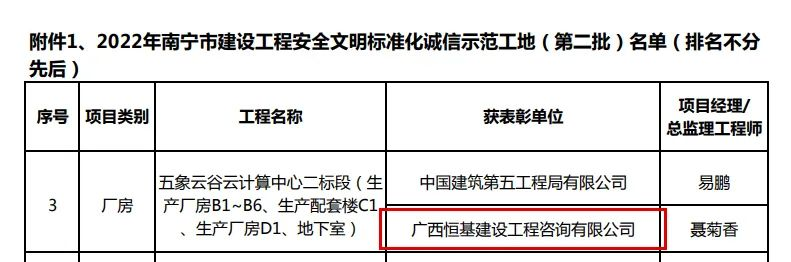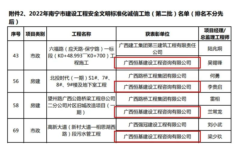 近日,南寧市建設(shè)工程質(zhì)量安全協(xié)會公布了“2022年南寧市建設(shè)工程安全文明標準化誠信工地(第二批)”名單,廣西恒基建設(shè)工程咨詢有限公司承建的5個項目獲此殊榮,其中1個項目被評為“南寧市建設(shè)工程安全文明標準化誠信示范工地”。
