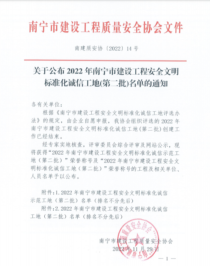 ▲2022年南寧市建設(shè)工程安全文明標準化誠信工地(第二批)獲獎名單