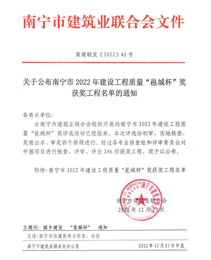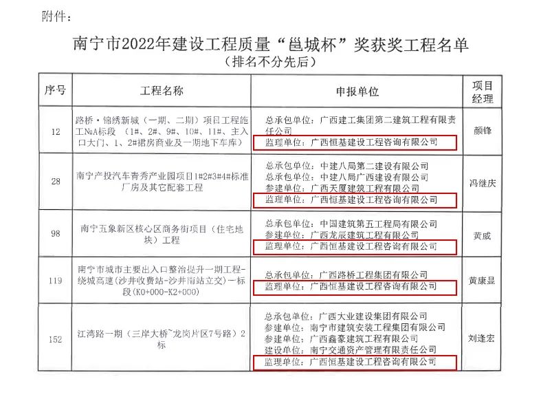 近日,南寧市建筑業(yè)聯(lián)合會公布了2022年建設(shè)工程質(zhì)量“邕城杯”獎獲獎工程名單,由廣西恒基建設(shè)工程咨詢有限公司擔任監(jiān)理單位的5個項目斬獲此殊榮。