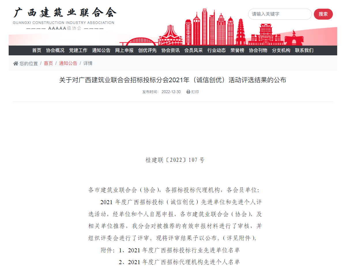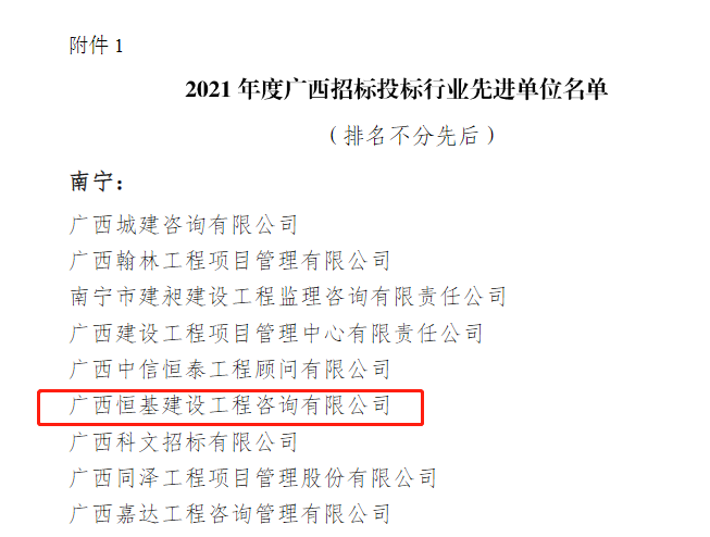 3月15日,廣西建筑業(yè)聯(lián)合會召開招標投標分會二屆四次會員代表大會,會上表彰了2021年度廣西招標投標行業(yè)先進單位以及2021年度廣西招標代理機構先進個人。廣西恒基建設工程咨詢有限公司在眾多參評單位中脫穎而出,榮獲“2021年度廣西招標投標行業(yè)先進單位”;同時,公司石愛娟、周赤衛(wèi)、覃漢東、劉世健、陸秒、任坤、黃俊才、方興8人獲評“2021年度廣西招標代理機構先進個人”稱號。