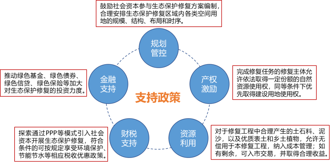 (一)國務(wù)院辦公廳發(fā)布《關(guān)于鼓勵(lì)和支持社會(huì)資本參與生態(tài)保護(hù)修復(fù)的意見》〔2021〕40號(hào)中提出社會(huì)資本可通過以下方式在生態(tài)保護(hù)修復(fù)中獲得收益: