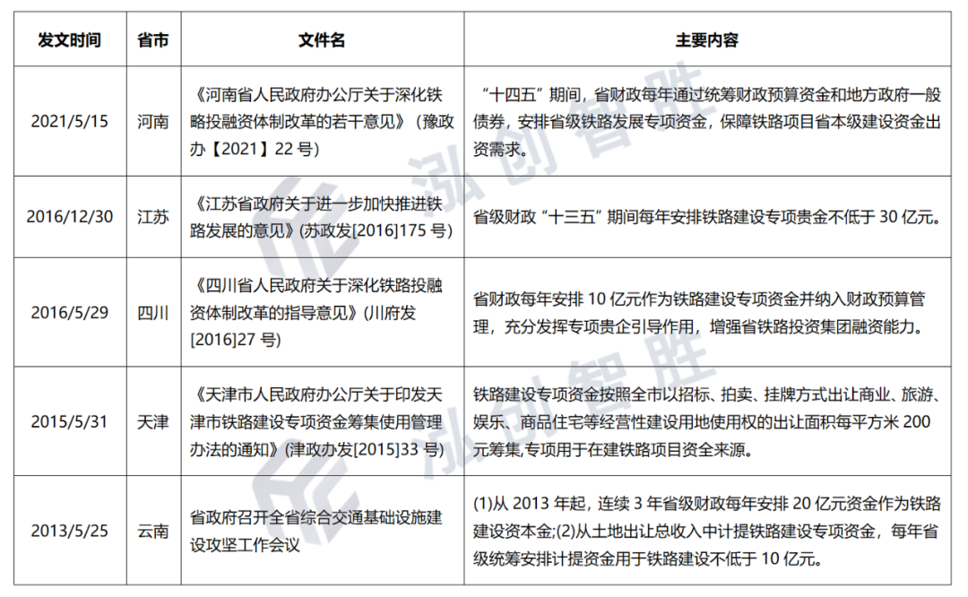 (2)鐵路建設(shè)專項(xiàng)資金,為了加快本省鐵路發(fā)展,部分省市出臺(tái)相關(guān)文件,明確安排鐵路建設(shè)專項(xiàng)資金。綜合部分省份的鐵路建設(shè)專項(xiàng)資金安排來看,一般是在土地出讓收入中提取一定比例專項(xiàng)用于省內(nèi)鐵路建設(shè)。
