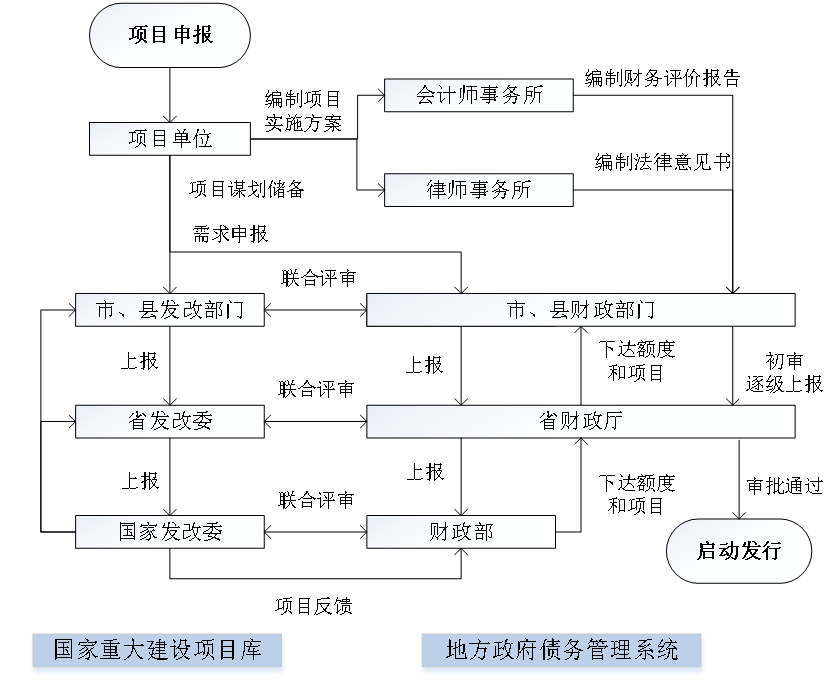 5 | 發(fā)改和財(cái)政部門審核并報(bào)同級政府批準(zhǔn)后,分別將項(xiàng)目情況錄入“國家重大建設(shè)項(xiàng)目庫”和地方政府債務(wù)管理系統(tǒng)“債券項(xiàng)目庫”。 | ||