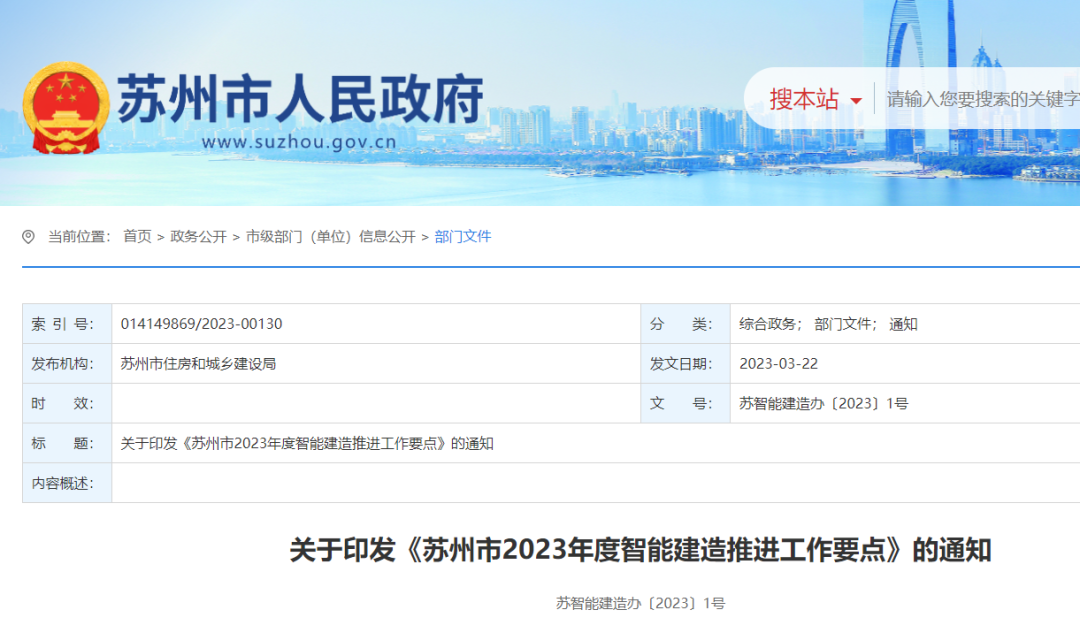 近日,蘇州市住建局印發(fā)《蘇州市2023年度智能建造推進工作要點》(蘇智能建造辦〔2023〕1號)。