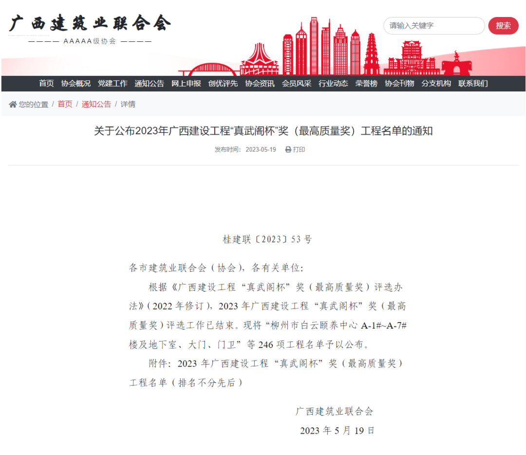 “真武閣杯”獎(jiǎng)是廣西建設(shè)行業(yè)工程質(zhì)量的最高榮譽(yù)獎(jiǎng)項(xiàng),該獎(jiǎng)項(xiàng)的評(píng)選工作是在廣西住房和城鄉(xiāng)建設(shè)廳指導(dǎo)下由廣西建筑業(yè)聯(lián)合會(huì)組織實(shí)施,旨在營(yíng)造推崇工匠精神的良好社會(huì)氛圍,推動(dòng)廣西建設(shè)工程質(zhì)量水平的提高。根據(jù)評(píng)選章程,在獲得廣西建設(shè)工程“真武閣杯”獎(jiǎng)(最高質(zhì)量獎(jiǎng))項(xiàng)目后,廣西建筑業(yè)聯(lián)合會(huì)將擇優(yōu)推薦作為國(guó)家優(yōu)質(zhì)工程獎(jiǎng)、中國(guó)建設(shè)工程魯班獎(jiǎng)等獎(jiǎng)項(xiàng)的候選工程項(xiàng)目。