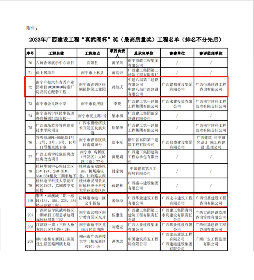 近日,廣西建筑業(yè)聯(lián)合會(huì)公布了2023年廣西建設(shè)工程“真武閣杯”獎(jiǎng)(最高質(zhì)量獎(jiǎng))工程評(píng)選結(jié)果。廣西恒基建設(shè)工程咨詢有限公司負(fù)責(zé)監(jiān)理的南寧市江灣路一期(三岸大橋~龍崗片區(qū)7號(hào)路)2標(biāo)工程項(xiàng)目、南寧產(chǎn)投汽車青秀產(chǎn)業(yè)園項(xiàng)目1#2#3#4#標(biāo)準(zhǔn)廠房及其它配套工程項(xiàng)目、防城港市擎天·海澳城二期一標(biāo)工程項(xiàng)目榮獲此獎(jiǎng)。