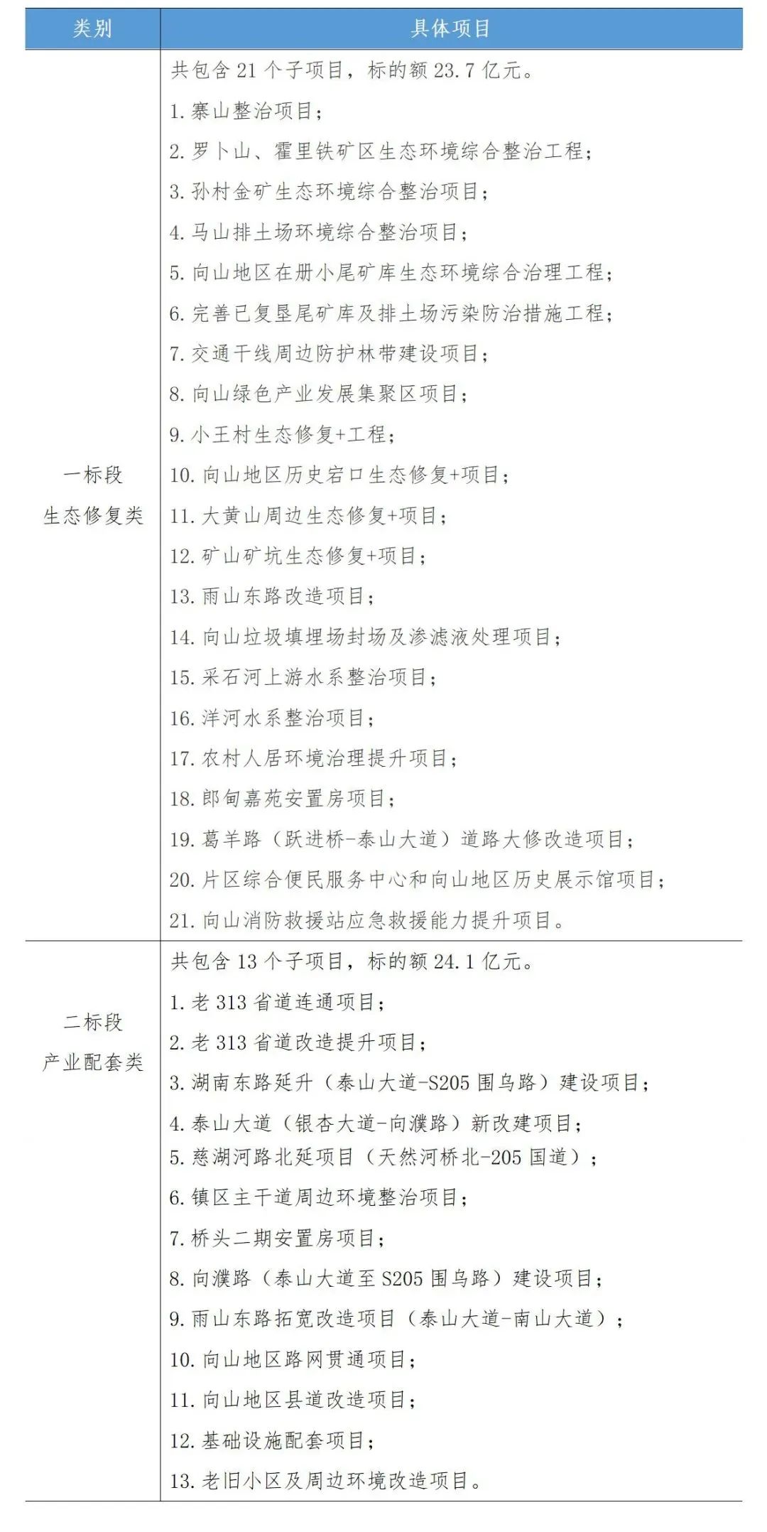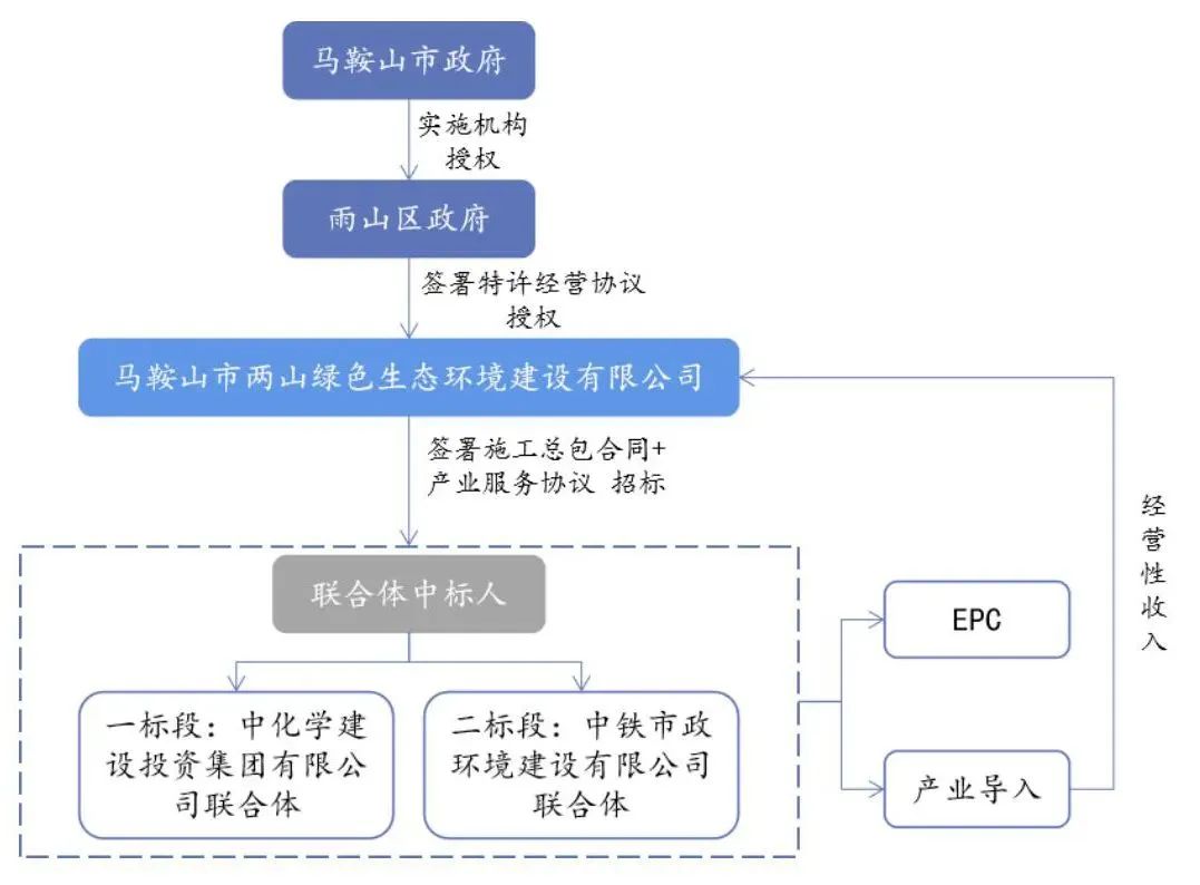 馬鞍山市向山地區(qū)生態(tài)環(huán)境導向的開發(fā)項目由馬鞍山市人民政府授權馬鞍山市雨山區(qū)人民政府為本項目實施機構,項目采取兩階段招標方式操作,項目第一階段由雨山區(qū)人民政府通過競爭性程序選擇馬鞍山市兩山綠色生態(tài)環(huán)境建設有限公司作為本項目的特許經(jīng)營者,負責向山EOD項目的投融資、建設和運營。項目第二階段由特許經(jīng)營者作為招標人以EPC+產(chǎn)業(yè)導入方式確定項目的總承包單位。其中,一標段中標人為:中化學建設投資集團有限公司聯(lián)合體;二標段中標人為:中鐵市政環(huán)境建設有限公司聯(lián)合體。