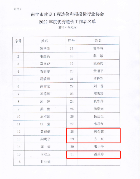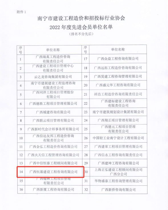 近日,南寧市建設(shè)工程造價和招投標(biāo)行業(yè)協(xié)會公布2022年度先進會員單位和優(yōu)秀造價工作者名單,廣西恒基建設(shè)工程咨詢有限公司成功獲評協(xié)會“2022年度先進會員單位”,公司黃金鑫、方興、潘美珍3人獲評協(xié)會“2022年度優(yōu)秀造價工作者”。