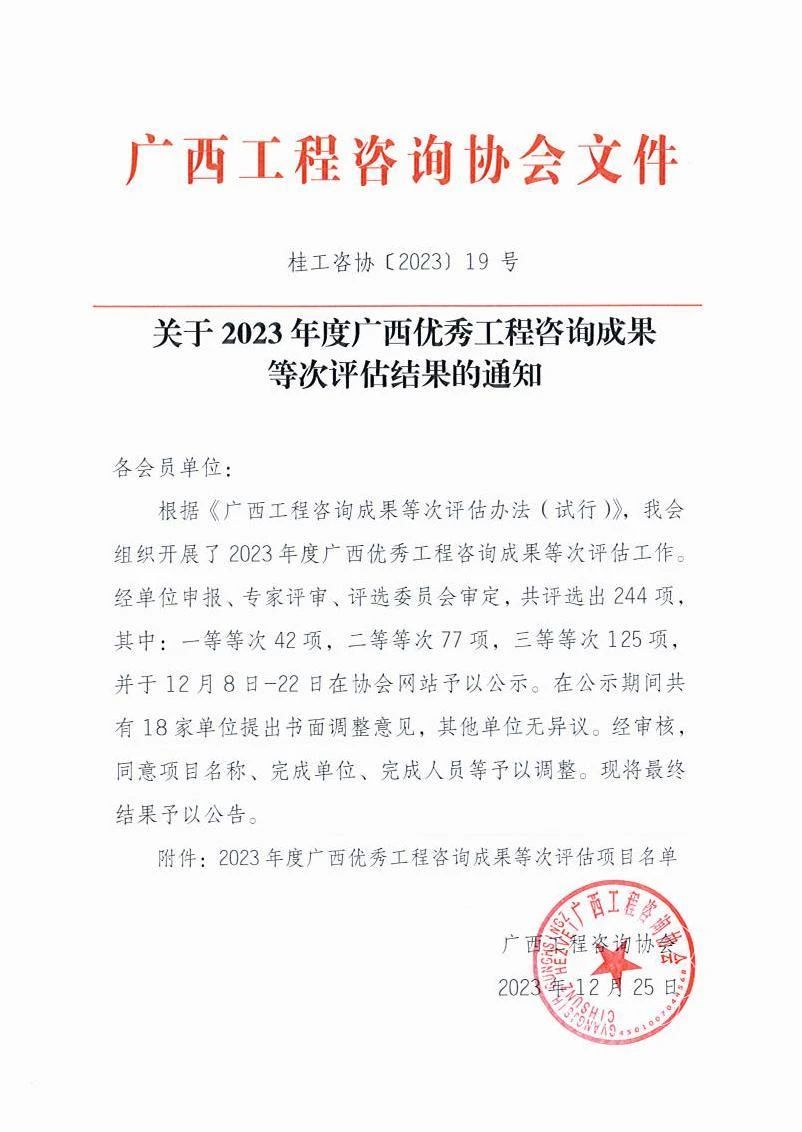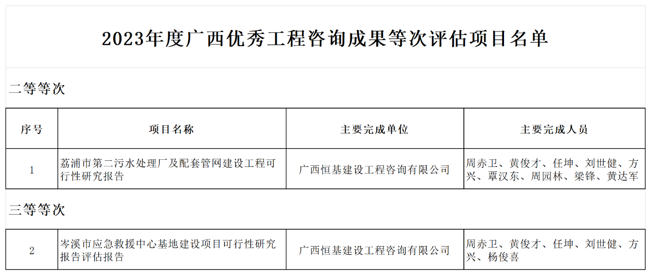 近日,廣西工程咨詢協(xié)會公布了2023年度廣西優(yōu)秀工程咨詢成果等次評估項目名單,恒基咨詢報送的兩項工程咨詢成果斬獲獎項,其中《荔浦市第二污水處理廠及配套管網(wǎng)建設(shè)工程可行性研究報告》榮獲二等等次,《岑溪市應(yīng)急救援中心基地建設(shè)項目可行性研究報告評估報告》榮獲三等等次。