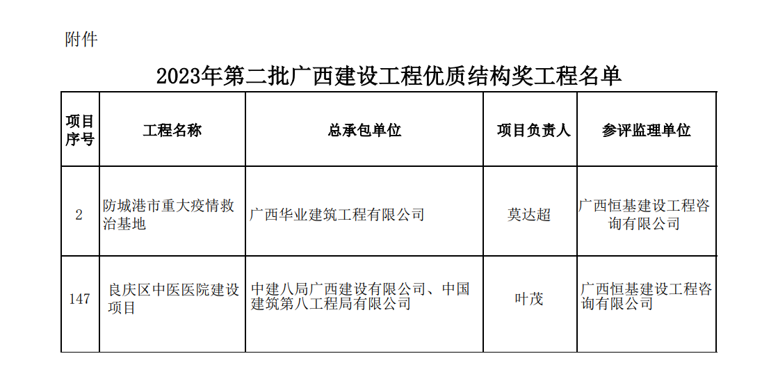 12月25日,廣西建筑業(yè)聯(lián)合會(huì)公布了2023年第二批廣西壯族自治區(qū)建設(shè)工程優(yōu)質(zhì)結(jié)構(gòu)獎(jiǎng)獲獎(jiǎng)名單,由恒基咨詢監(jiān)理的《防城港市重大疫情救治基地》《良慶區(qū)中醫(yī)醫(yī)院建設(shè)項(xiàng)目》位列其中。