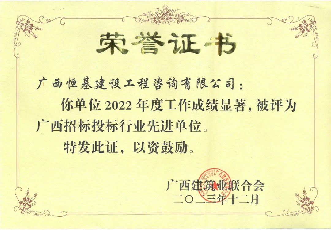 12月25日,廣西建筑業(yè)聯(lián)合會(huì)招標(biāo)投標(biāo)分會(huì)召開第二屆第五次會(huì)員代表大會(huì),會(huì)上表彰了2022年度廣西招標(biāo)投標(biāo)行業(yè)先進(jìn)單位和先進(jìn)個(gè)人。恒基咨詢榮獲“2022年度廣西招標(biāo)投標(biāo)行業(yè)先進(jìn)單位”稱號(hào),公司8人獲評(píng)“2022年度廣西招標(biāo)投標(biāo)行業(yè)先進(jìn)個(gè)人”。