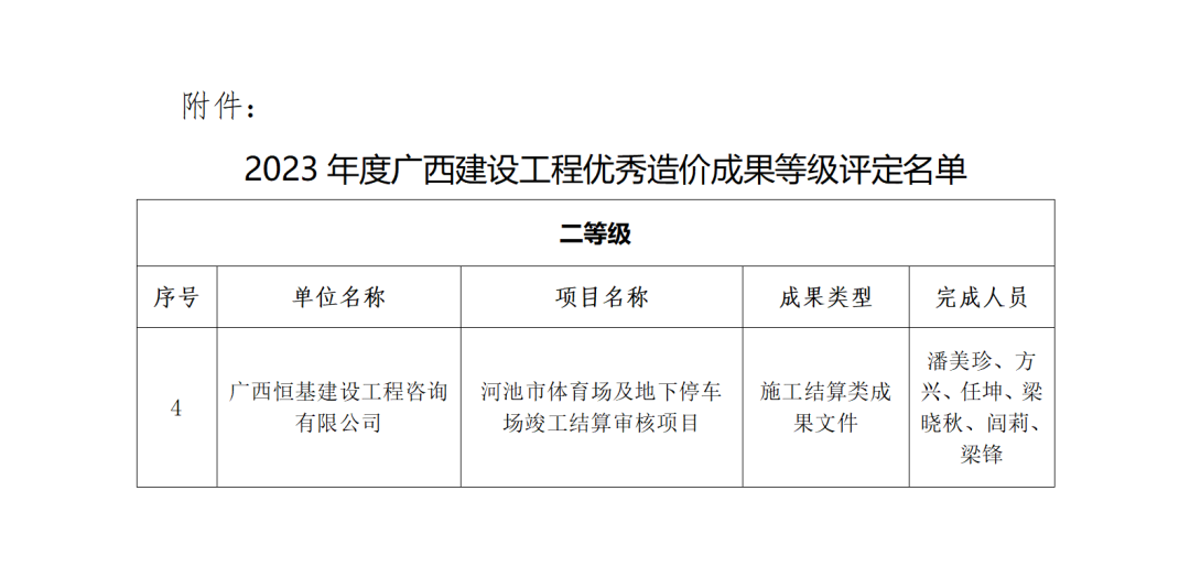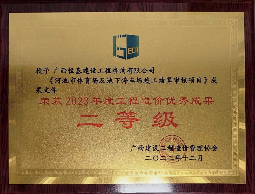 近日,廣西建設(shè)工程造價(jià)管理協(xié)會(huì)召開第五屆第五次理事會(huì)暨第三次會(huì)員代表大會(huì),會(huì)上頒發(fā)2023年度優(yōu)秀工程造價(jià)成果等級(jí)評(píng)定證書,恒基咨詢《河池市體育場及地下停車場竣工結(jié)算審核項(xiàng)目》成果文件榮獲2023年度工程造價(jià)優(yōu)秀成果二等級(jí)。