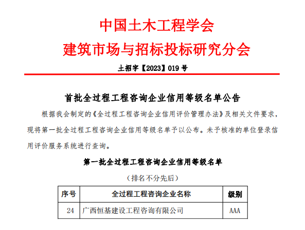 近日,中國土木工程學(xué)會建筑市場與招標(biāo)投標(biāo)研究分會公布了第一批全過程工程咨詢企業(yè)信用等級名單,恒基咨詢位列其中,獲評最高等級AAA級信用評級。
