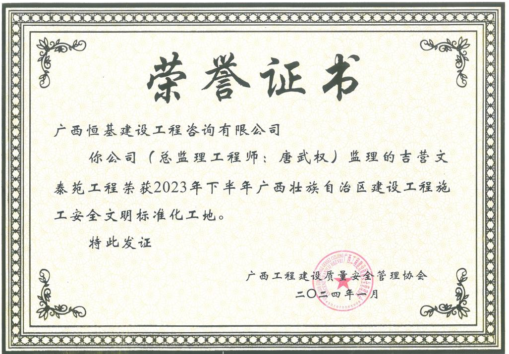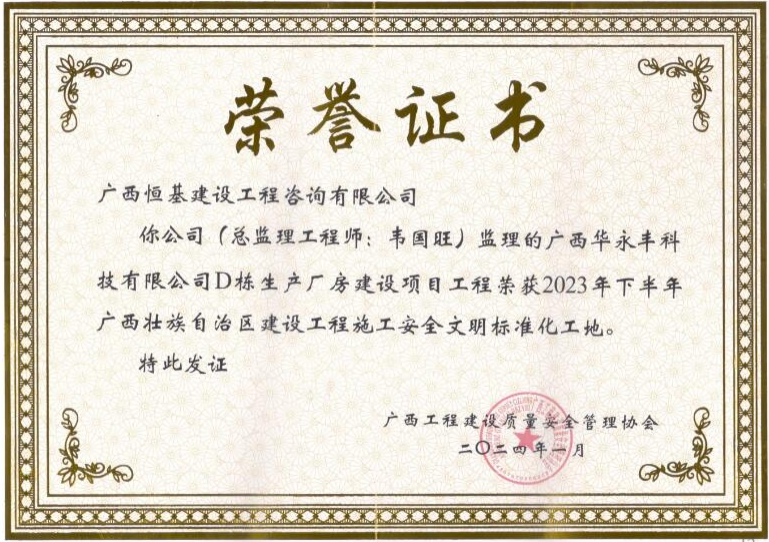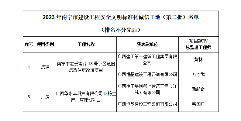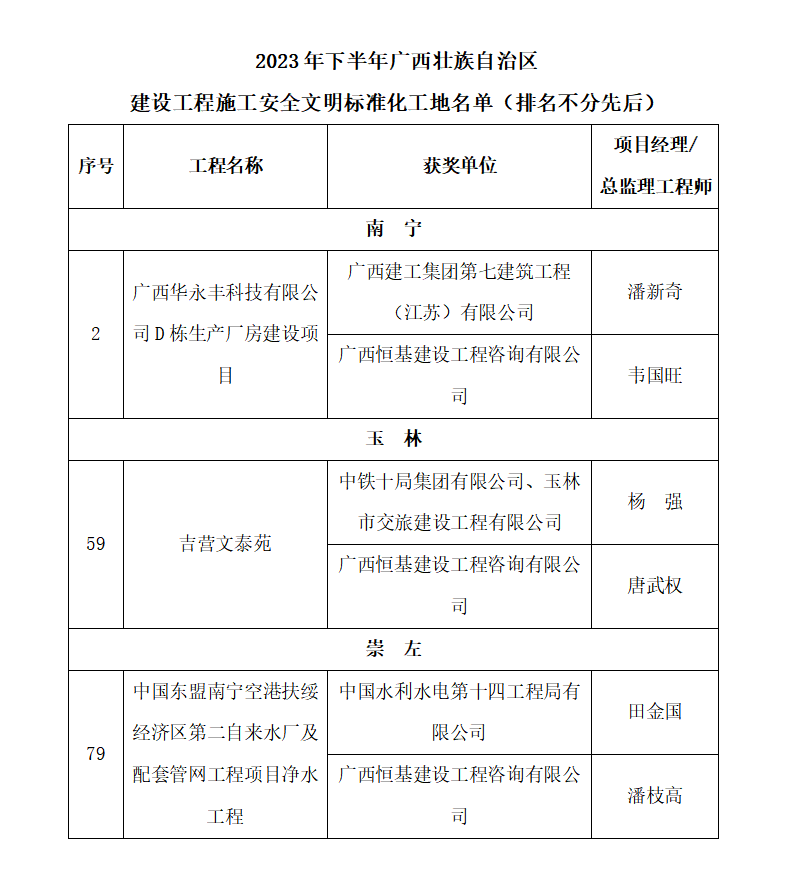 近日,廣西工程建設(shè)質(zhì)量安全管理協(xié)會(huì)、南寧市建設(shè)工程質(zhì)量安全協(xié)會(huì)分別公布了2023年下半年廣西壯族自治區(qū)建設(shè)工程施工安全文明標(biāo)準(zhǔn)化工地名單、2023年南寧市建設(shè)工程安全文明標(biāo)準(zhǔn)化誠信工地(第二批)名單。恒基咨詢3個(gè)項(xiàng)目榮獲2023年下半年廣西壯族自治區(qū)建設(shè)工程施工安全文明標(biāo)準(zhǔn)化工地,2個(gè)項(xiàng)目榮獲2023年南寧市建設(shè)工程安全文明標(biāo)準(zhǔn)化誠信工地。