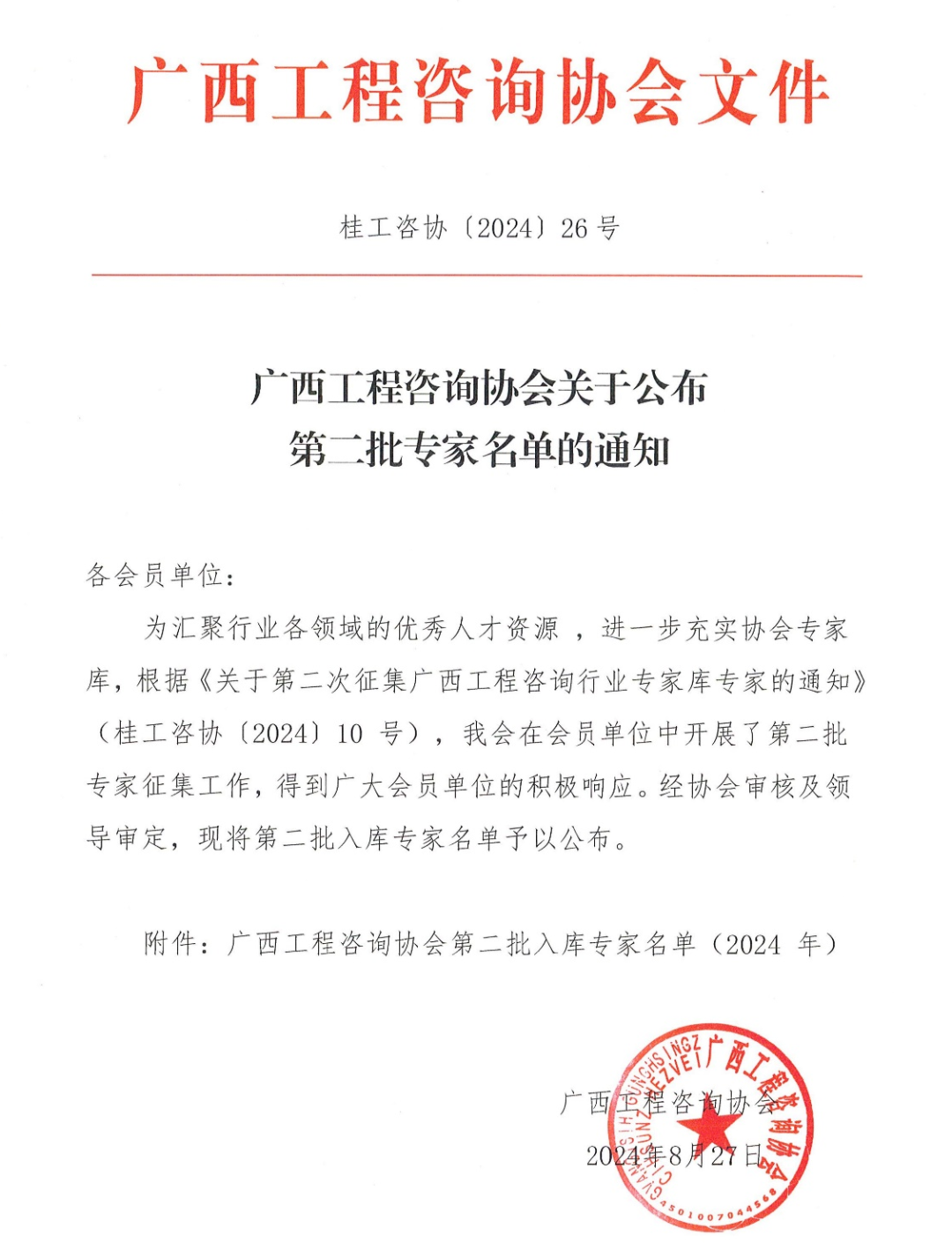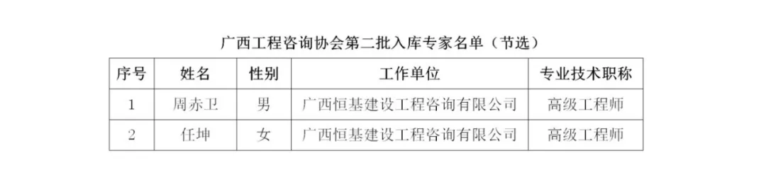 2024年8月27日,廣西工程咨詢協(xié)會(huì)公布了第二批入庫(kù)專家名單,廣西恒基建設(shè)工程咨詢有限公司周赤衛(wèi)、任坤2位專家順利入庫(kù)。