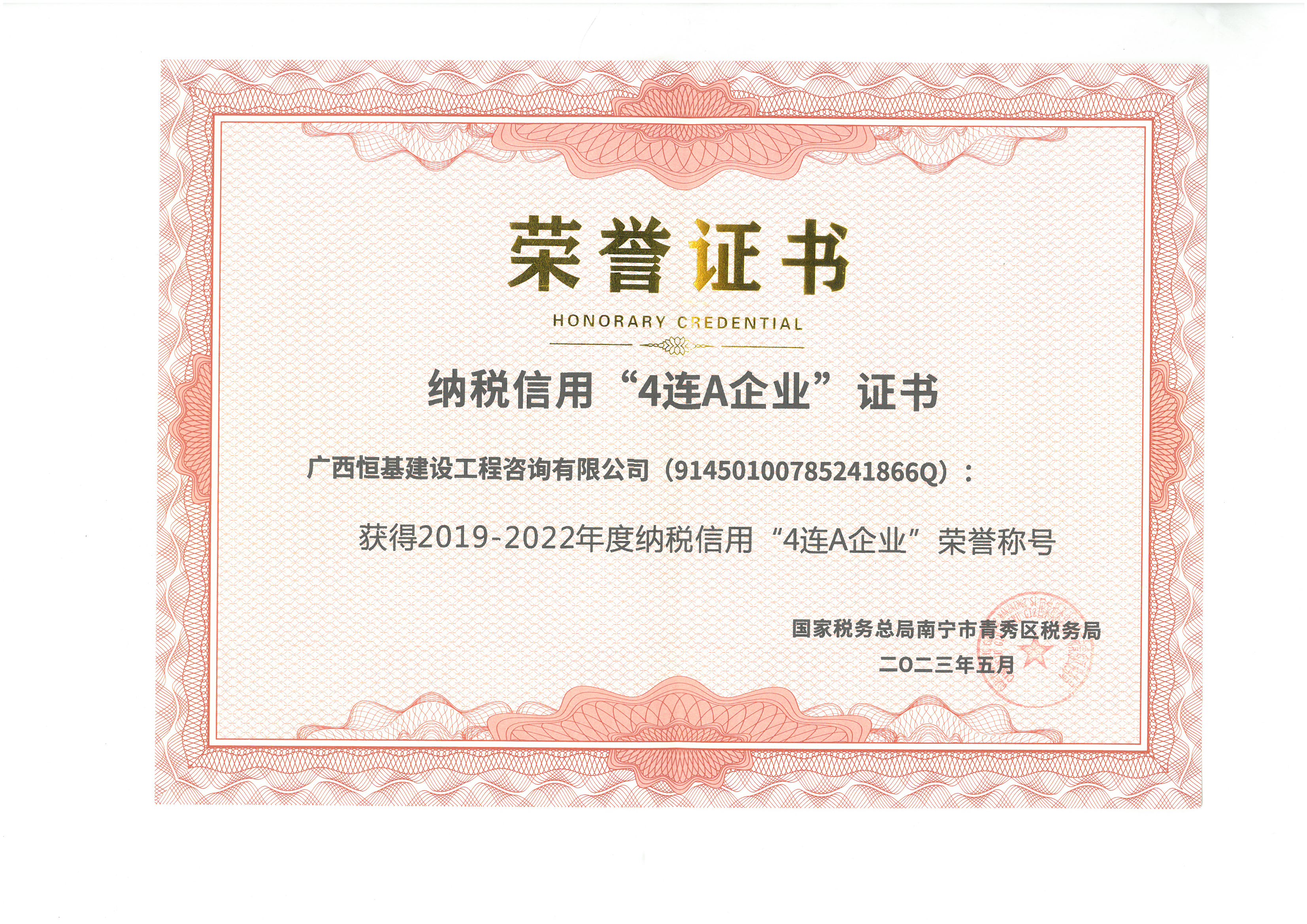 "2019-2022年度納稅信用“4連A企業(yè)”榮譽稱號 "