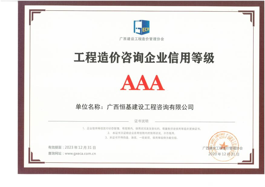 工程造價咨詢企業(yè)信用等級AAA
